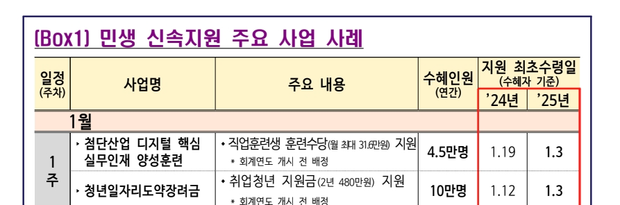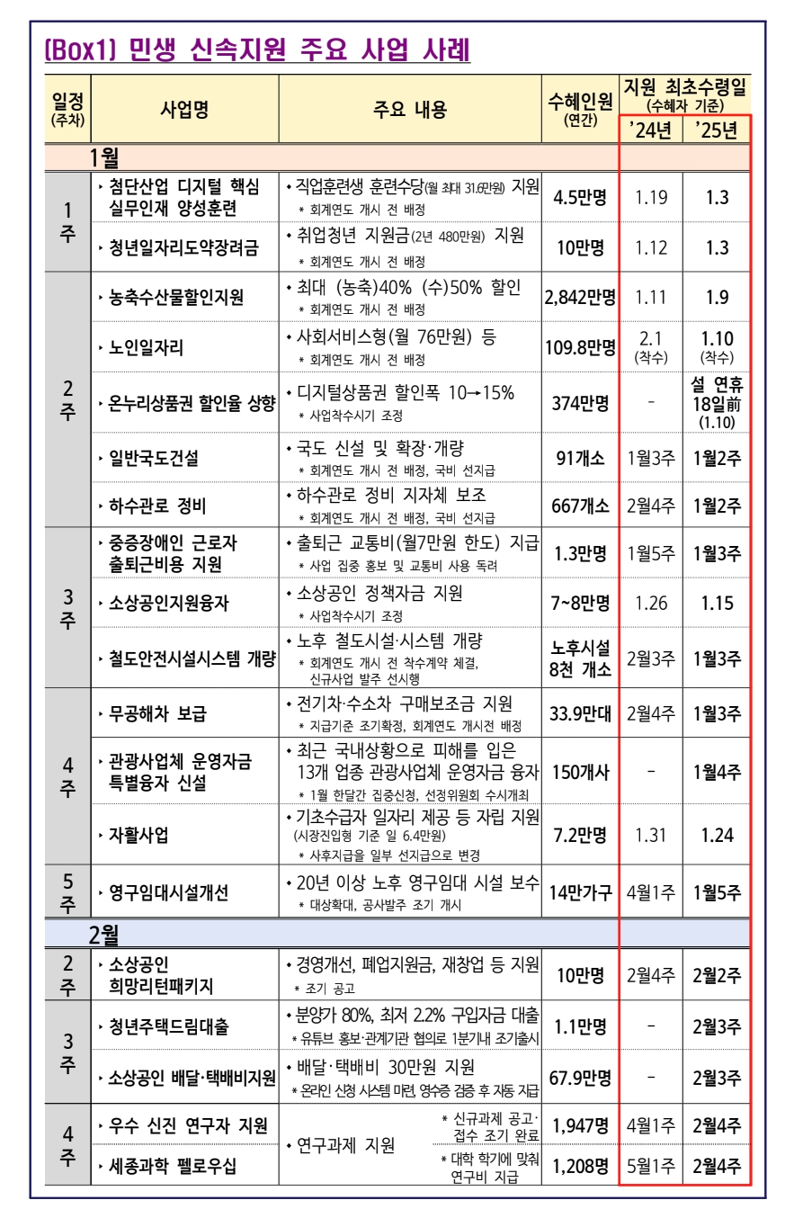 민생지원 일정을 살펴보면 경제를 활성화하기 일환으로 24년 일정에 비해서 올해는 1월, 2월로 앞당겨져서 진행되는 일정들이 늘어났는데요~