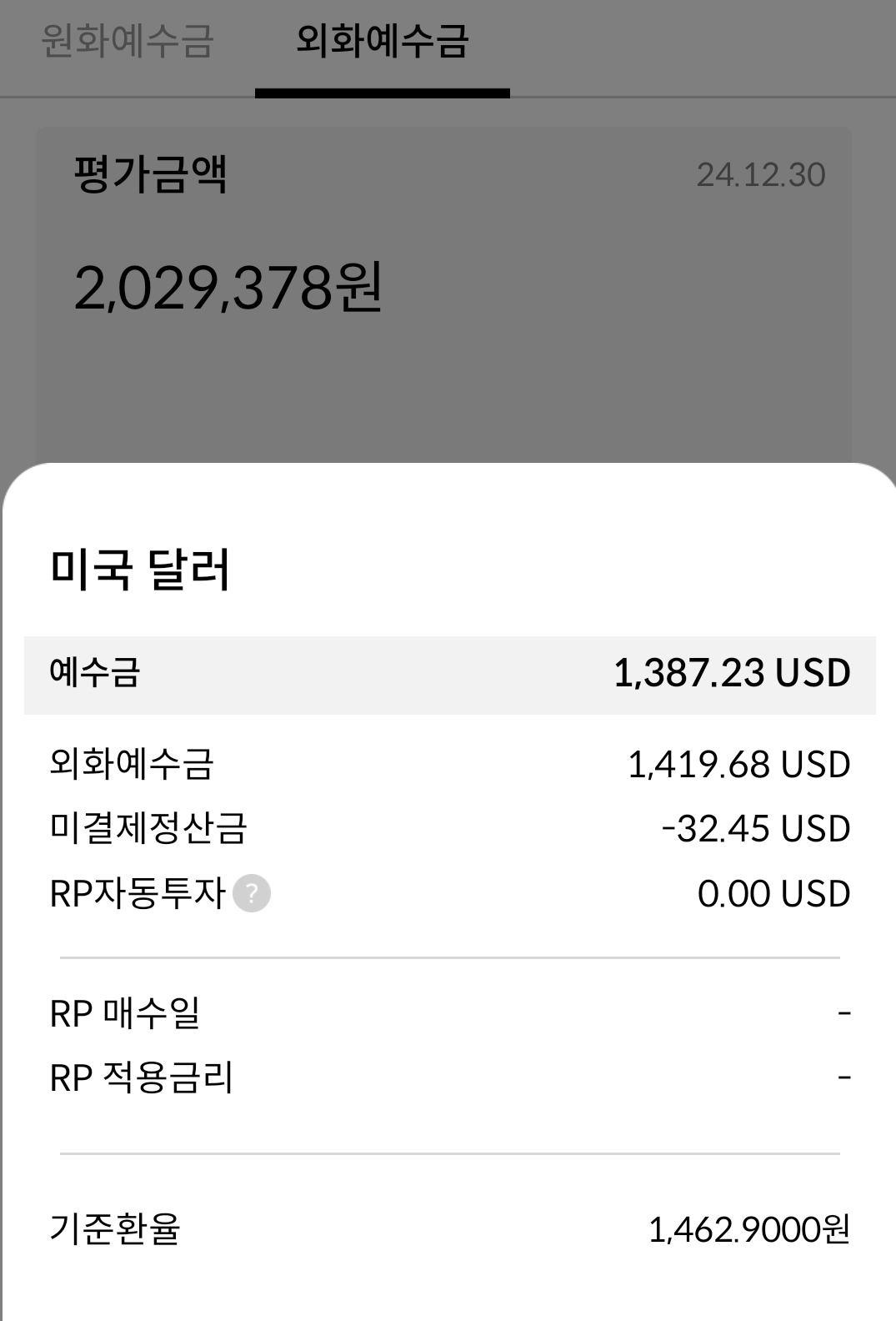 (외화예수금은 소수점 거래로 미국 주식거래해서 미결제정산금으로 잡혀있네요.)