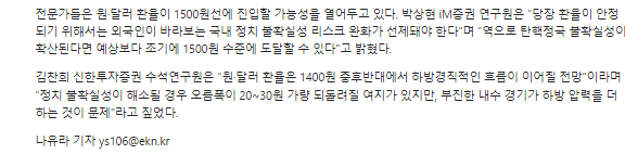 국내 분위기가 안정화되기전에는 내년에는 1500선까지 달러가 오를수 있다는 전망들이 나오고 있는대요.
