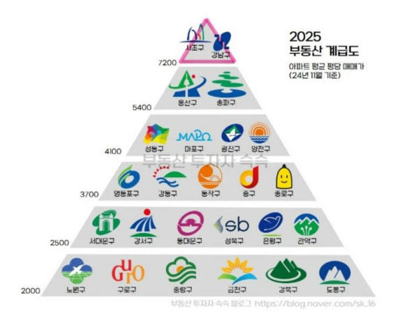 참고로 부동산 투자자 슥슥 블로그에서 만들어 주신 아파트 평균 평당 매매가 기준 2025부동산 계급도 참고하셔서