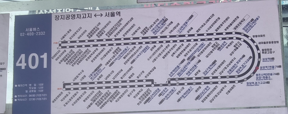 서울 401번 버스는 장지공영차고지에서 시작하여 서울역까지 운행하는 간선 버스인데요.