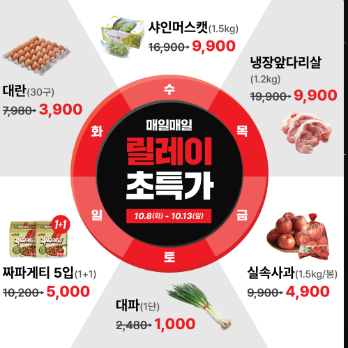 행사 대표 상품으로는 △대란(30구) 3900원 △샤인머스켓(1.5kg) 9900원 △냉장앞다리살(1.2kg) 9900원 △실속사과(1.5kg·봉) 4900원 △대파(1단) 1000원 △짜파게티 5입(1+1) 5000원 등이 있다.