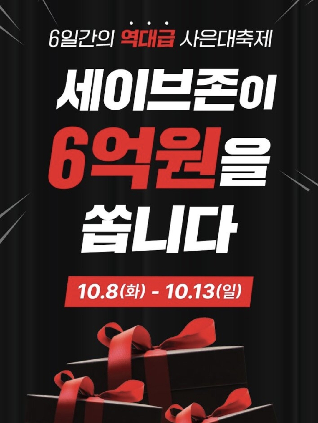 6일간 역대급 사은대축제는 10.8(화)~10.13(일)까지 진행됩니다.