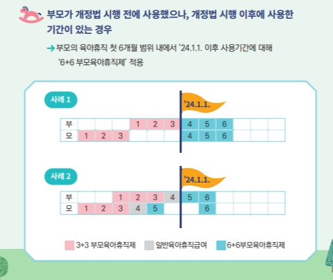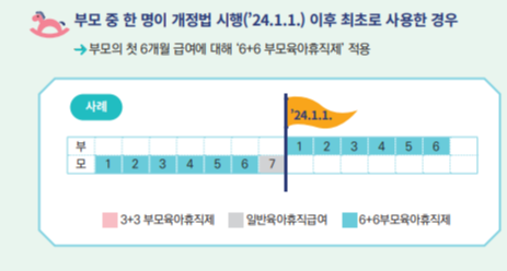 부모의 육아휴직 첫 6개월 범위내에서 '24. 1.1 이후 사용기간에 대해 '6+6 부모육아휴직제'를 적용합니다.