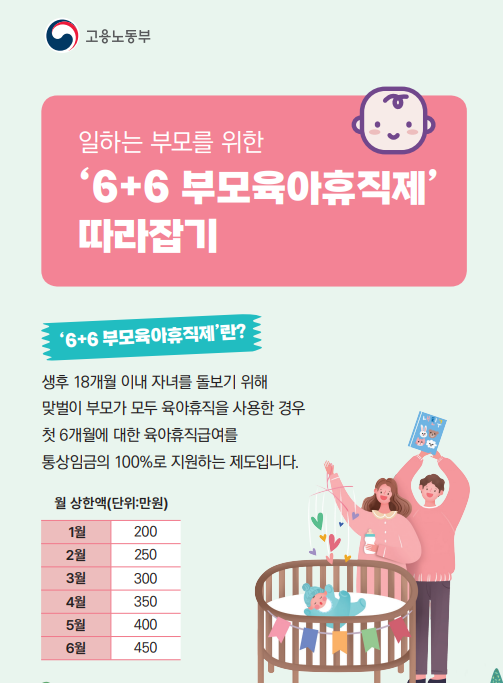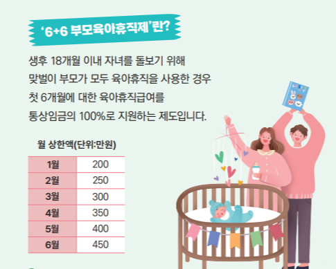 부모의 첫 6개월 급여에 대해서 '6+6 부모육아휴직제'를 적용합니다.