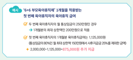 따라서 첫번째 육아휴직자에게는 우선 일반 육아휴직급여(월 상한액 150만원)울 지급하고, 두번째 육아휴직자의 육아휴직급여를 지급할 때 첫 번째 육아휴직자의 차엑분(6+6 적용급여-일반 육아휴직급여)을 지급합니다.