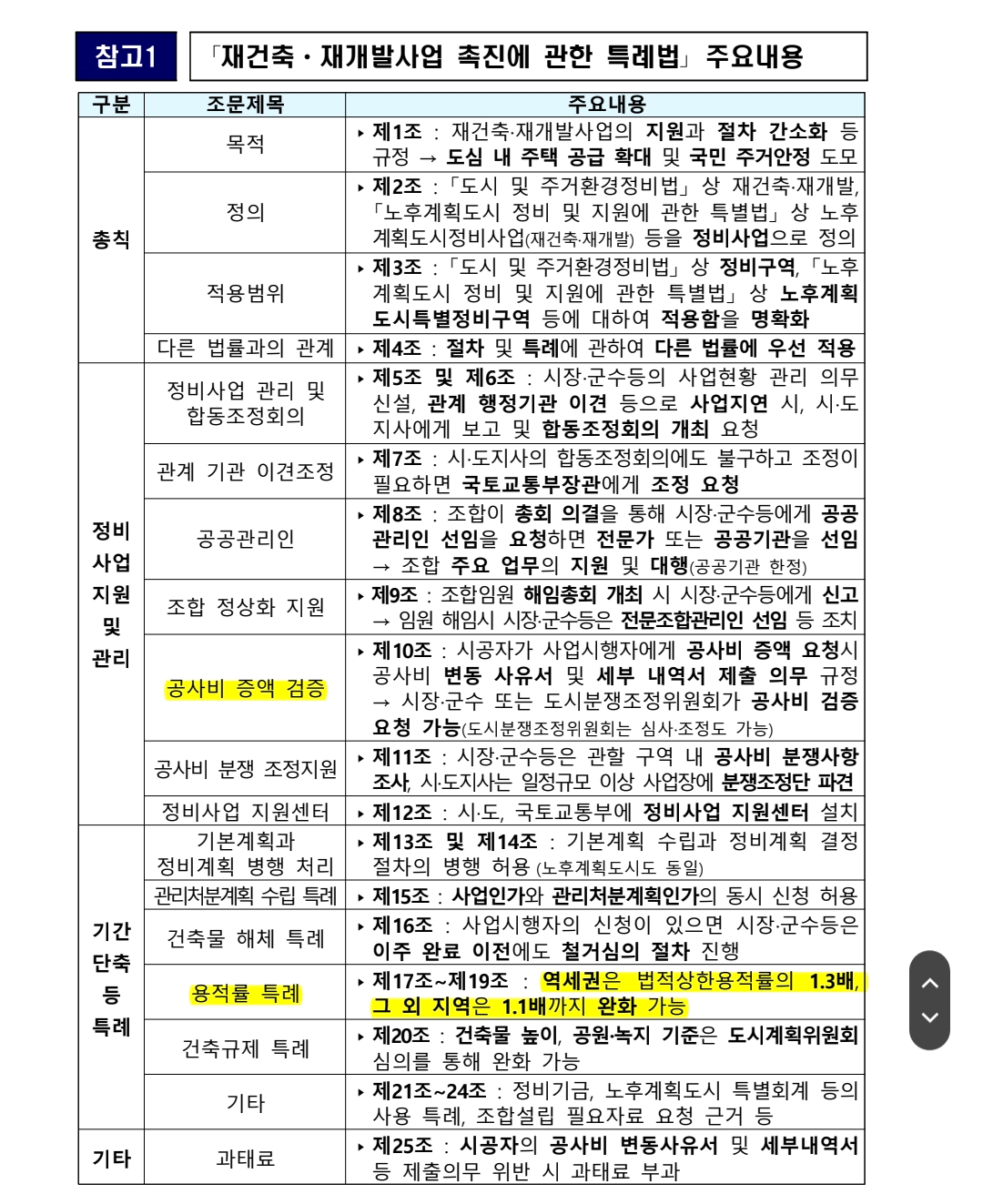 국토교통부, 재건축 재개발 특례법 제정안 및 도정법 간소화 3년 단축 (9/2자)
