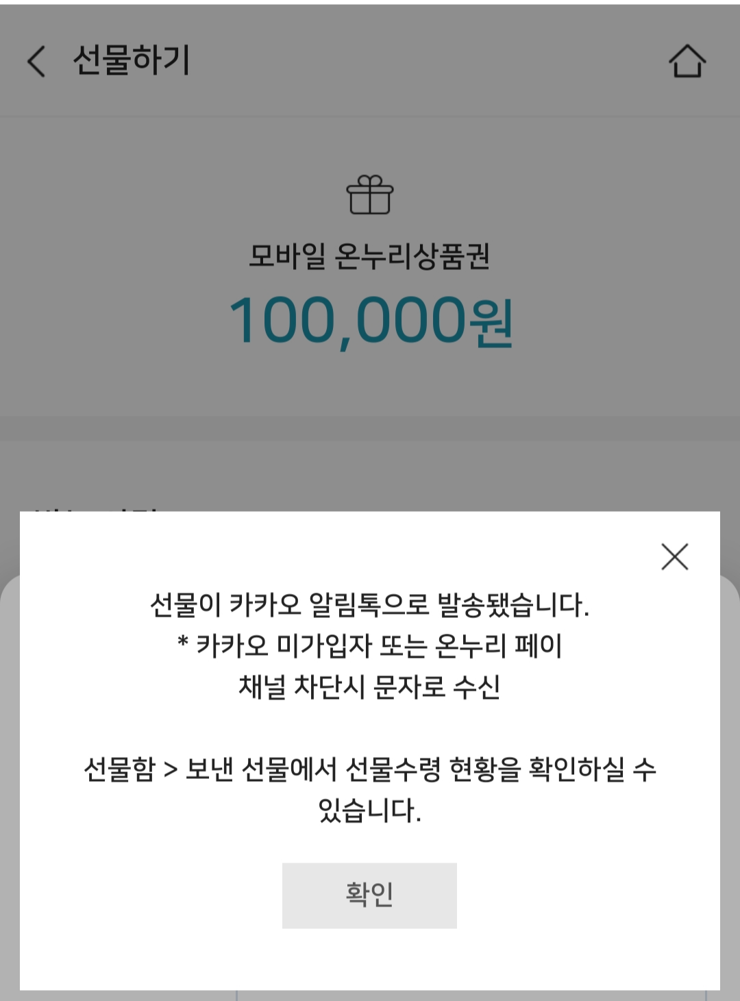 전송을 하면 선물이 카카오 알림톡으로 발송됏습니다. 라는 안내문을 받게 되는데요.