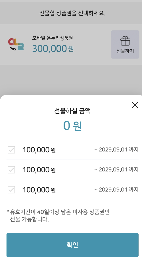 10만원권 2장으로 선택 후 구매하기를 눌러 주었어요...