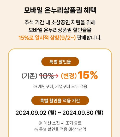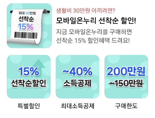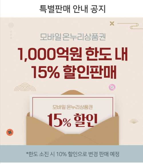 선착순으로 진행되는 온누리모바일상품 구매 서두르셔서 15%할인혜택 꼭 받아가시 바랍니다.