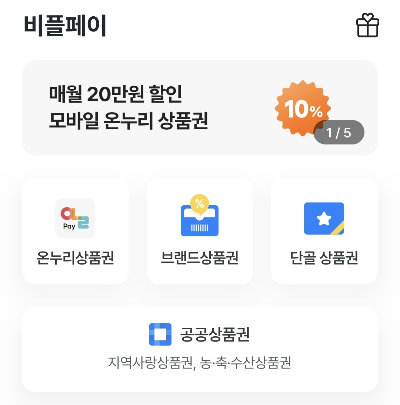비플페이 앱 접속후 인증하고 공공상품권(지역사랑상품권, 농축수산상품권) 화면을 터치하면 농할상품권을 구매할수 있습니다.