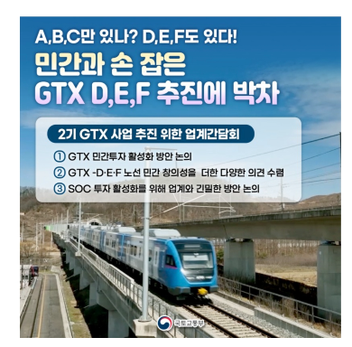 국민들께 GTX 서비스를 신속하게 누리기 위해서 정부 재정을 기본으로 민간재원으로 투자도 필수적인 만큼, GTX 관련 업계, 지자체와 지속적으로 소통(지차체 권역별 "찾아가는 릴레이 설명회" 개최 등), 후속 절차들을 차질없이 진행할수 있도록 속도감있게 추진하겠다고 밝혔습니다.