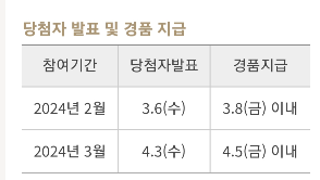 참여기간 24년 3월경우 당첨자발표는 4.3(수), 경품지급은 4.5(금) 이내 지급됩니다.