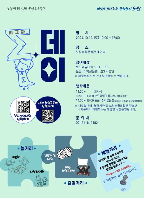 보드게임과 도전! 골든벨 참여원하시면 꼭 사전접수를 해주시고 10월 12일에 펼쳐지는 노원수학문화관 시그마데이에서