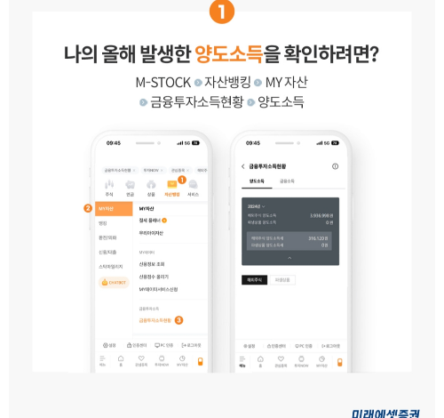 M-stock→ 자산뱅킹 → MY자산 → 금융투자소득현황 → 양도소득
