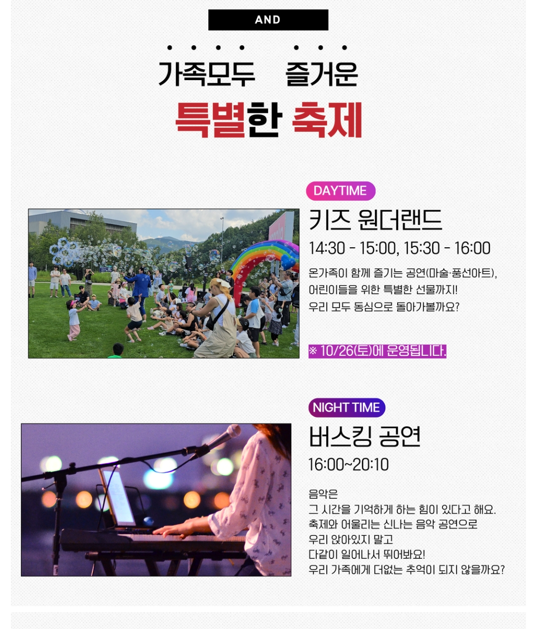 아이들을 위한 키즈 원더랜드, 버스킹 공연이 준비되어 있습니다.
