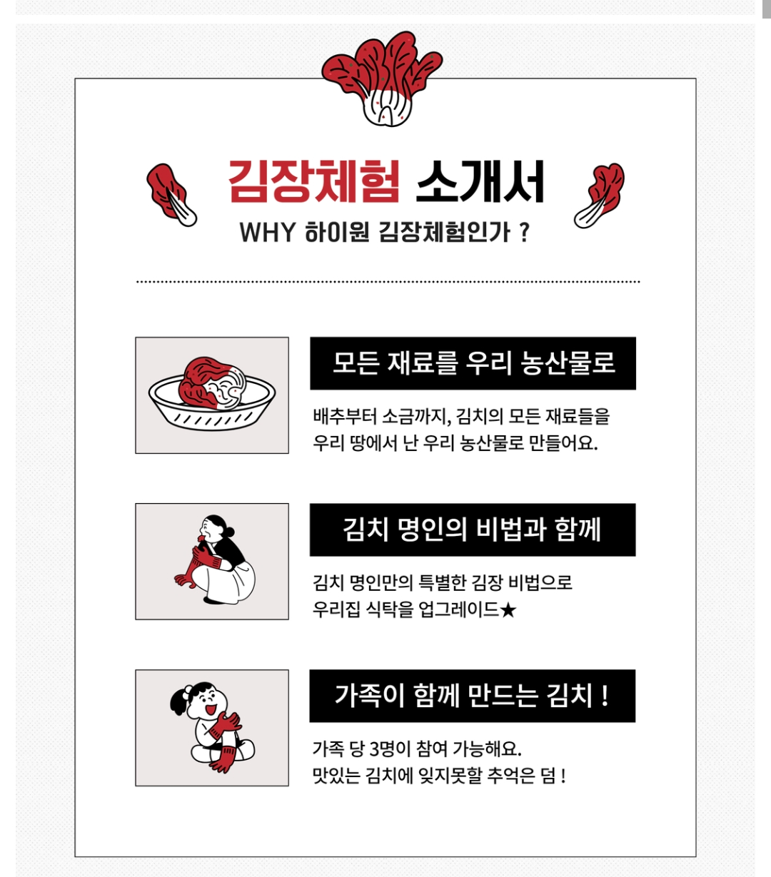 - 포장 제공: 체험 종료 후, 김장김치 5kg을 아이스박스에 포장해 가져갈 수 있습니다.