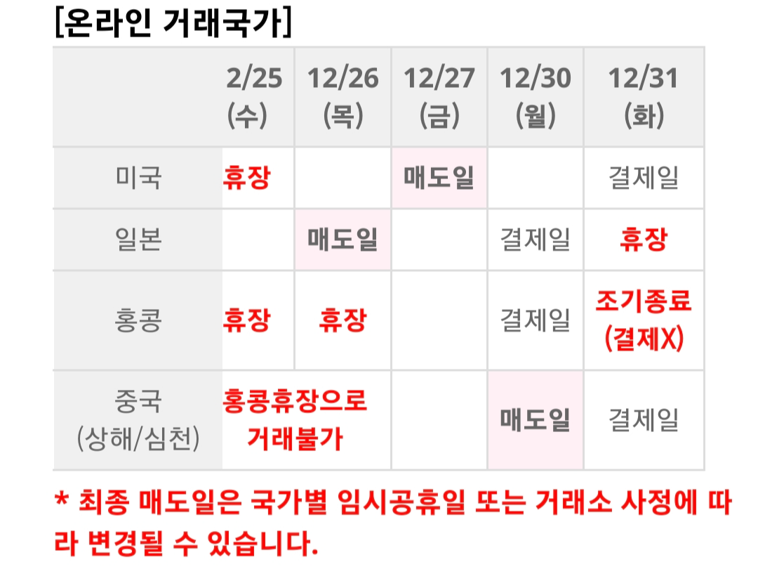 거래 국가별로 휴장, 최종매도일, 결제일이 서로 달라서 마지막 매도일과 결제일을 꼭 확인해 주세요~